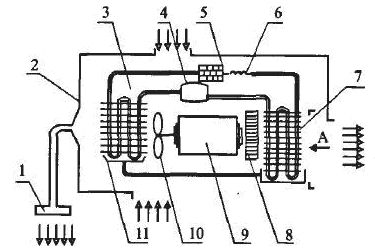 6、毛細管 7、冷凝器 8、軸流風扇 9、電動機 10、離心風機